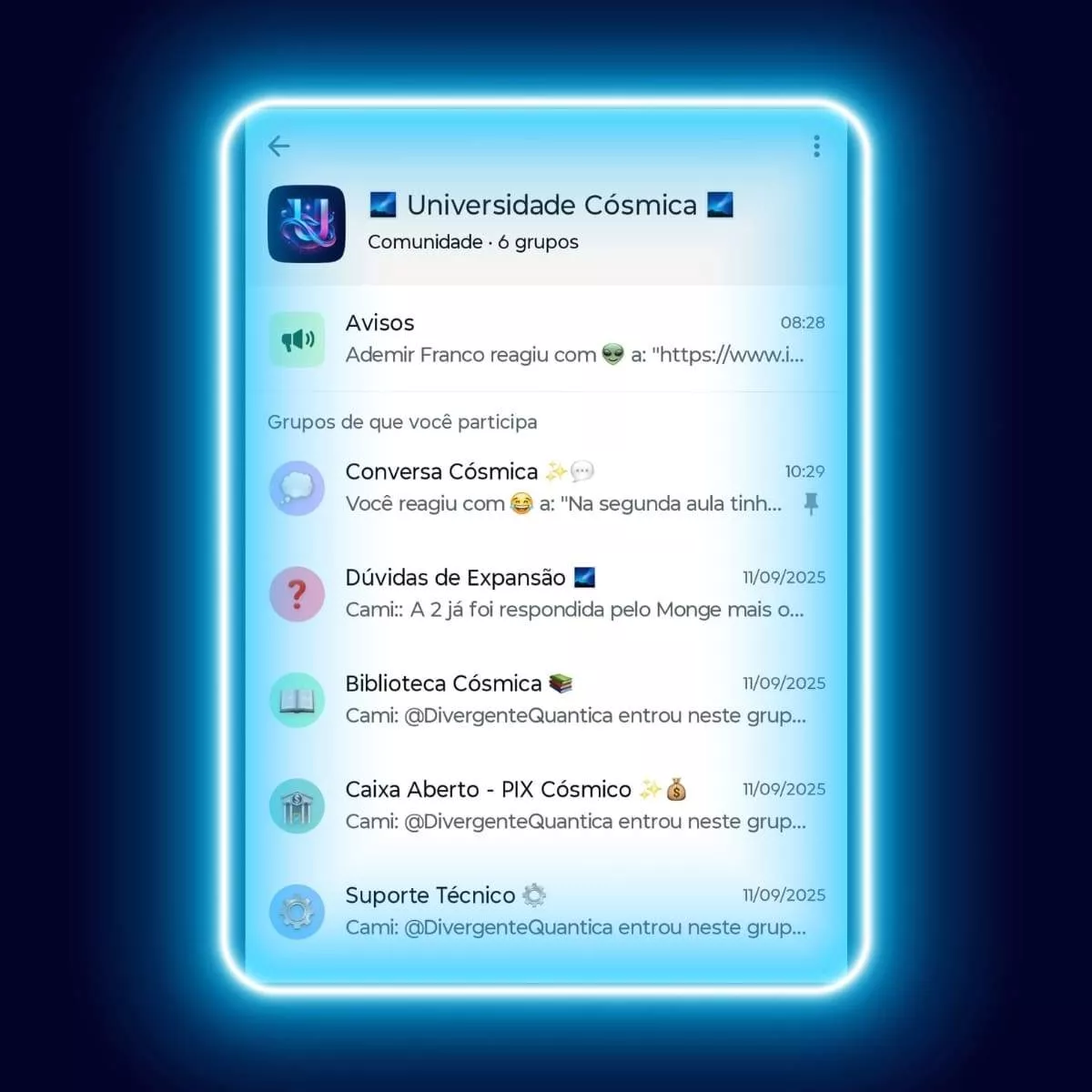 A Universidade Cósmica é um templo vivo de sabedoria, onde o SER se expande além dos limites da realidade comum. Um espaço sagrado que une mundos visíveis e invisíveis, trazendo ensinamentos canalizados e saberes multidimensionais (por meio do acoplamento) para recordar a verdade que já habita em nós: a Fonte que somos.